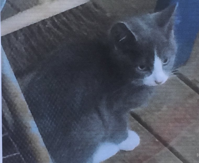 Grå og hvit kattunge funnet i Ullandhaugskråningen. Korthåret, grå med hvit snute og hvite poter. Gjemmer seg og er sky, men ser ikke ut som en villkatt. Alt for liten til å være ute på egenhånd.