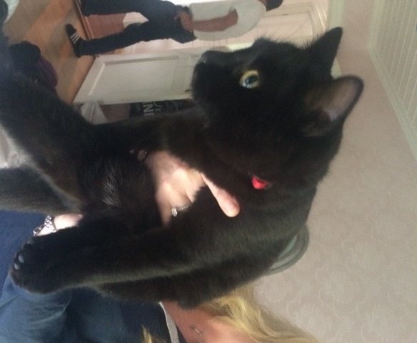 Helt sort, veldig kjælen. Rødt halsband, ung hunnkatt/kattunge.