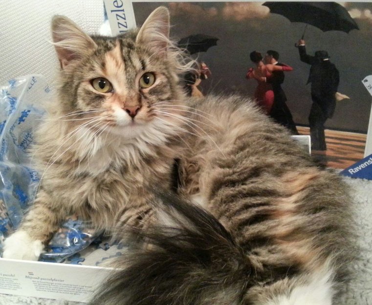 Hvite poter og hvit på brystet. Orange stripe på høyre del av ansiktet. Stor tykk hale med masse pels.