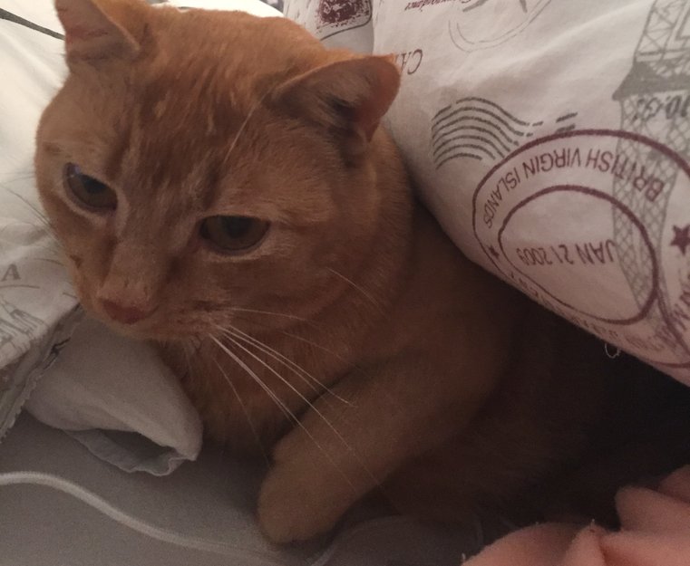 rødbrun pen katt med blått registreringsnummer i det ene øret - tillitsfull og veldig snill!