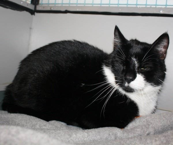 Sort og hvit katt. Er øremerket, men øremerkingen er utydelig.