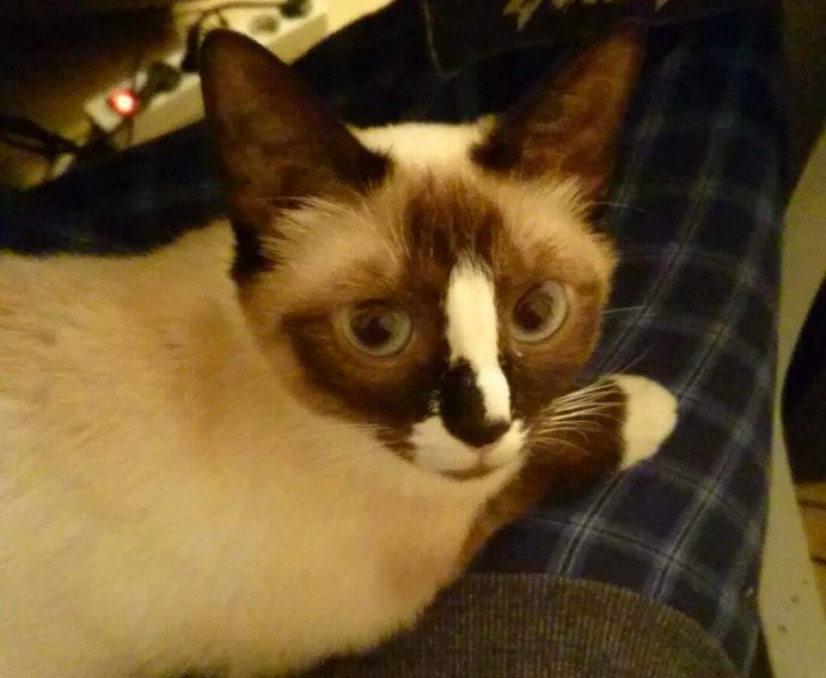 Sort og hvit, med hvite poter, med sorte støvletter. Sort og hvit nese