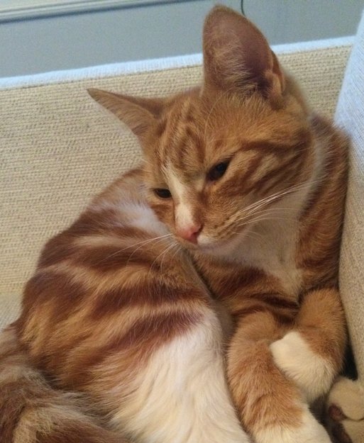 Nydelig mørk oransje med fin pels. Hvit snute, mage og under haken. Ung og slank.