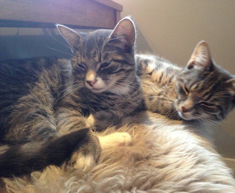 Det er katten som er nærmest kamera på bildet. På bildet er han en ungkatt, så han er noe kraftigere nå. Han er grå og svart tigerstripet med tre hvite poter, litt hvitt under haka og rundt snutepartiet. Han er tillitsfull og kosete. Han har chip.