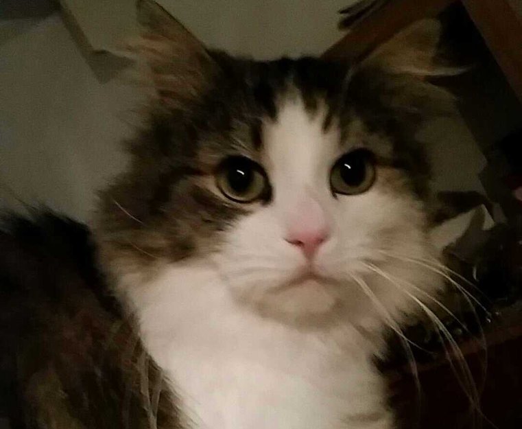 Han er veldig sky, ikke prøve å fange han da han kan bli redd å flytte seg lenger fra hjemmet. Ring 45105082 om du ser han. Han har ett nesten symmetrisk hvitt bliss i ansiktet. Lyse rosa nese. Mørk stripet på rygg, sider å hale. Hvite bein med to små svarte flekker på den ene siden. Svart stripe med litt lengre hår langs ryggraden og stor tung hale med svarte lange hår. Om man ser veldig nærme har han noen få hvite hår på haletuppen. Grønne øyne. Relativt liten å slank. Ca 4 kg. Han er chipet, kastrert og merket med en grønn M i øret.