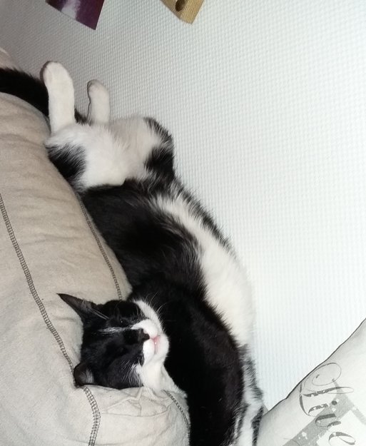 Han er svart og hvit ,ganske "ragdoll" aktig når du bærer han. Veldig kosen og fortrolig med de fleste.