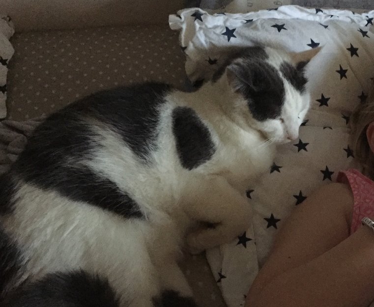 Junior kom hjem for ca en halv time siden. Tynn og sulten. Sliten og kosete:) ligger nå og sover😊