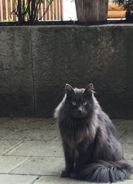 Grå, langhåret katt som den siste uken har prøvd å komme inn i leiligheten vår flere ganger. Mulig noe tynn, men har fin og tykk pels. Virker vant til folk og mjauer. Ikke observert i området før(bodd her i 10 år) og har ikke halsbånd.