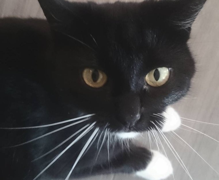Sort katt, hvit fra haken og nedunder hele magen, og på alle potene. Har rosa halsbånd med bjelle på.