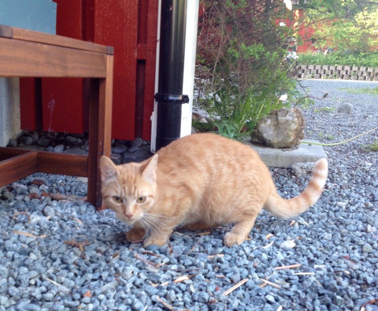 Katten har oppholdt seg rundt husene her, mjauer og vil inn. Har ikke sett den her før, så jeg tror den kan ha gått seg bort. Virker tillitsfull og kjælen.