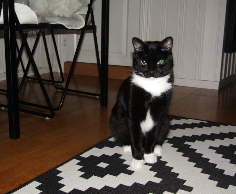 Sort med hvit hake, hals, mage og hvite sokker på labbene. Korthåret, glad i andre katter men menneskesky. Milan er ca. 3 kg, lang men slank.