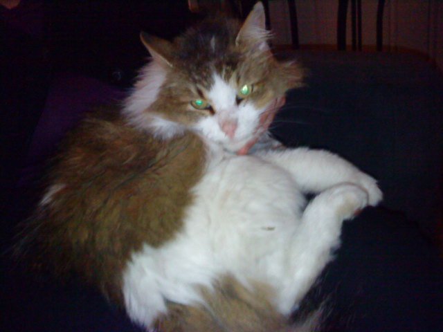 Brun og hvit, med litt mørkt i det brune. Langhåret. Snill og kos. Sulten.
