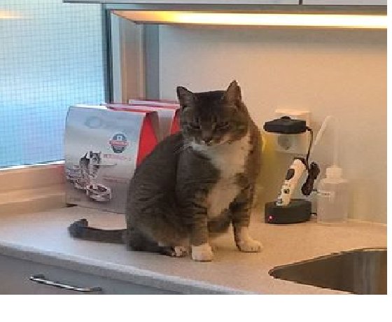 Han har et sår på ene kinnet og en liten rift i øret. Noe stivbent gange Fargen er: viltfarget med hvit. Korthåret huskatt han er 14 år gammel