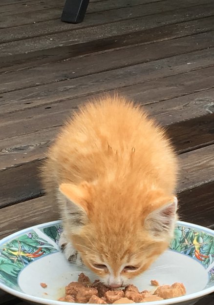 Liten kattunge funnet nederst på Randem. Langhåret og rød. Den er svært sky, men kommer for å få mat.