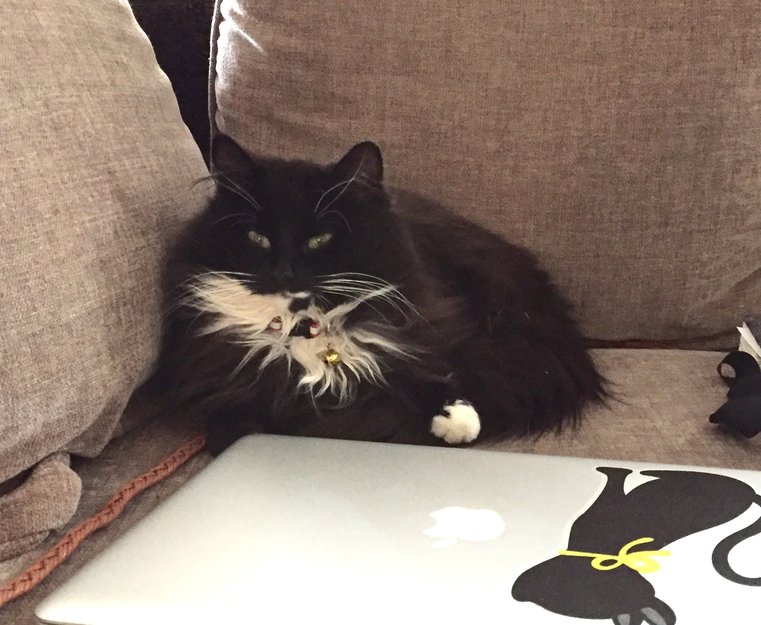 Katten har tykk svart pels med hvit bryst og hvite "sokker" har også en sort flekk på haken. Har rødt halsbånd med refleksstripe. Er liten av størrelse og vekt.