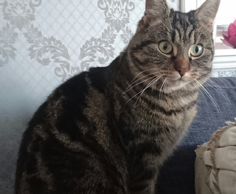 Lita spraglete/tigerstripet frøken på ca 4 kg. Hun har mørkebrun pels, med sorte striper på bena og flekker. Beige brun mage. Har ett lite arr på høyre øre.