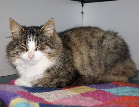 Snill og kjælen ukastrert hannkatt, langhåret med bruntigret pels, hvitt på brystet, labbene og i ansiktet.