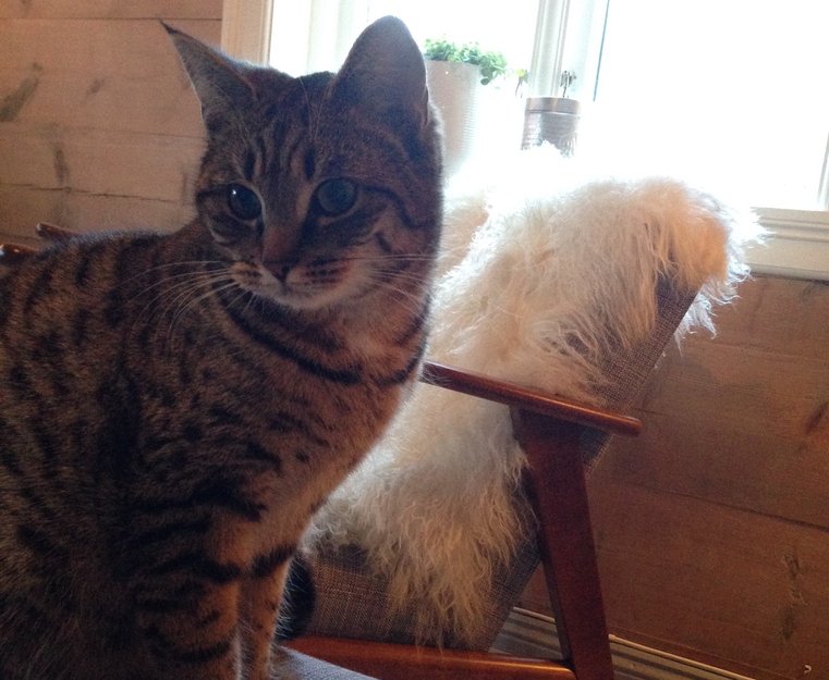 Hon har en vil prick på bröstet och har efter ett veterinär besök för 6 månader sedan blivit barret på mitten och på toppen av halen så allt hår var inte utväxt där. Hon är liten men tuff och ganska så skeptisk mot bilar och okända människor. Annars världens koeligaste lilla katt. 2 år gammal och kan många gånger påminna om en bengal i teckningen. Lite prickig på ryggen annars tigrerad.
