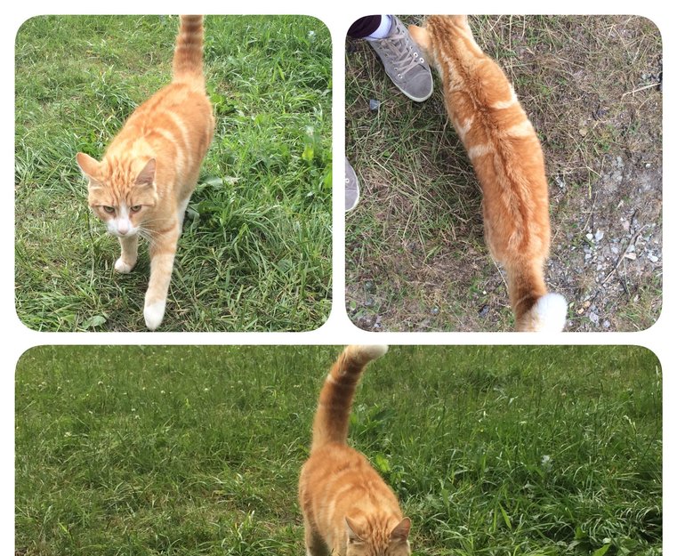 Det så ut som en lett tigerstripet rød og hvit huskatt. Veldig tam og tillitsfull.