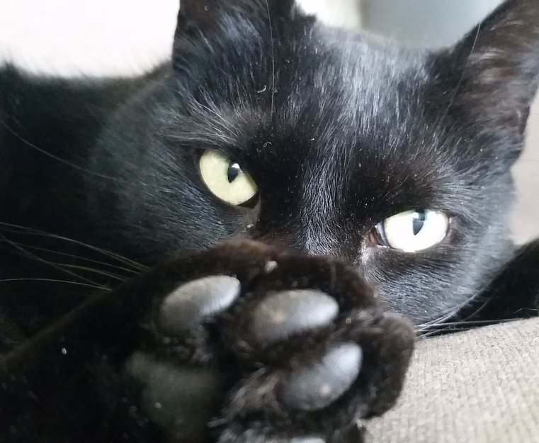 Helsvart, blank pels, store gule øyne. Snill. Kosete. Glad i voksne, ikke spesielt glad i små barn. Vanlig størrelse, ca 3 år gammel. Litt "hengemage" under buken. Blir veldig glad for alle tips!!! :)