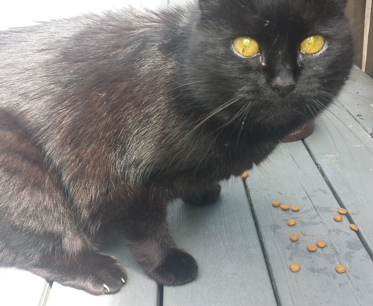Katten oppsøkte oss på hytta våres. Den var innom i helgen som var også. Den er sjekket for chip på Fredrikstad Dyrehospital, men hadde ikke det. Katten er noe pjuskete og var veldig sulten. Den er sluppet løs her ved hytta igjen, i håp om at den hører til i nærheten. Men den virker ikke å bli tatt vare på.