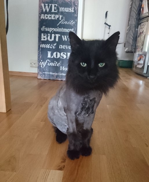 Langhåret og sort men er løveklippet så kroppen ser grå ut.