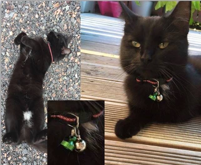 Svart . Liten og tynn katt under 1år. Er litt hvit under på halsen. Har en ett rødt bånd rundt halsen med bjelle og en grønnkopp på. Jeg tror at den grønne koppen er sånn du kan putte navn til eier i. Den var dessverre tom.