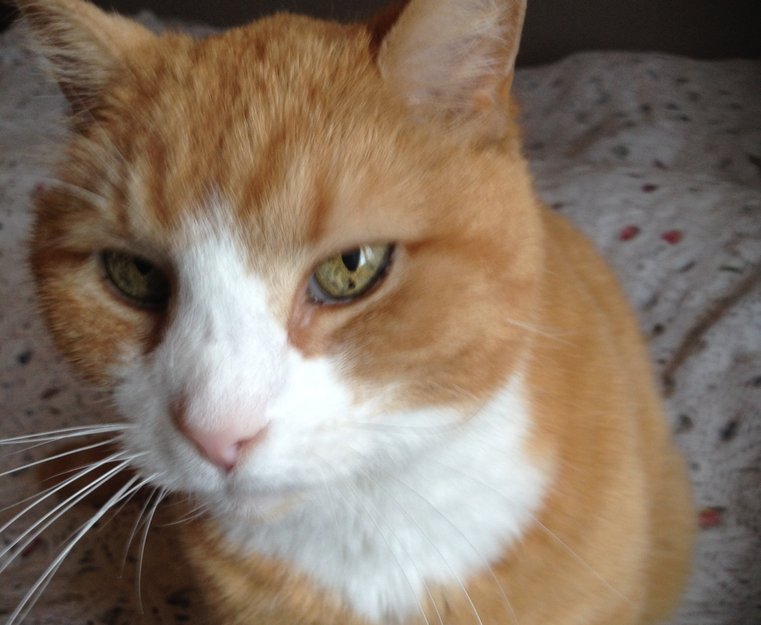 Oransje med hvite tegninger. Hvite sokker, hvit i ansikt og på mage. Grønngule øyne. Rosa snute. 16 år gammel.