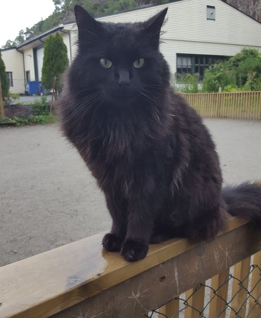 Svart kontaktsøkende katt holder til ved læringsverkstedet Valen barnehage. Langhåret med en god del floker i pelsen.