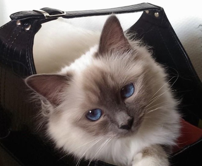 Rase Hellig Birma. Hun er hvit med blåmasket ansikt og hale. Hvite sokker. Blå øyne. Hun er semi langhåret. Hun har en lyslilla halsbånd på seg med lilla hjerte. Hun er også chipet.