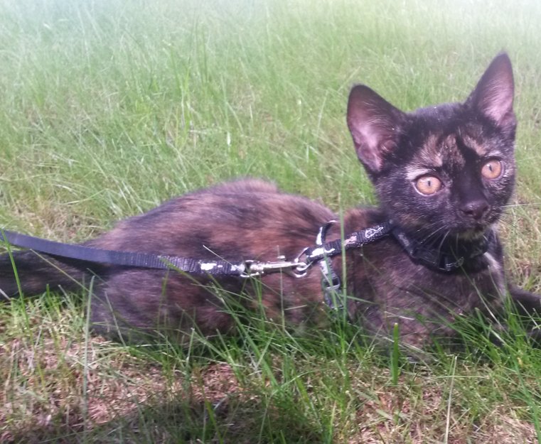 Hun er 3 mnd gammel. Stort sett svart med brune flekker. Har også hvite små flekker rundt øyene.