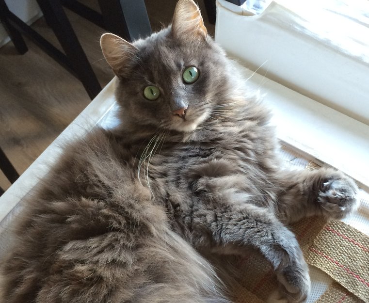 Lysegrå, langhåret hunnkatt. Hun har grønne øyne og lang rufsete hale, med hvit haletipp.