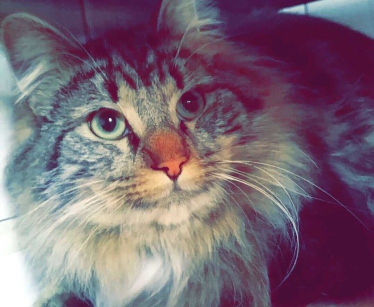 Langhåret, grå, hvit og sort katt. Markerte trekk i ansiktet, særlig spesiell over snuten som er en mer brun farge. Han har hvite "sokker" på alle fire ben. På undersiden/magen har han sorte "leopardflekker". Ryggsiden er nesten helt svart samt halepartiet.