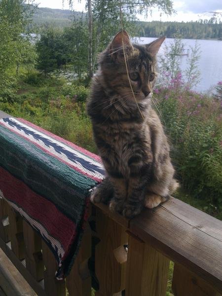 Sissi er en tillitsfull og kjælen jentepus på 8 mnd. Hun er brun/grå med gyldenbrunt over ryggen og lysere felt på brystet. Lang raggete hale og ganske langhåret ellers.