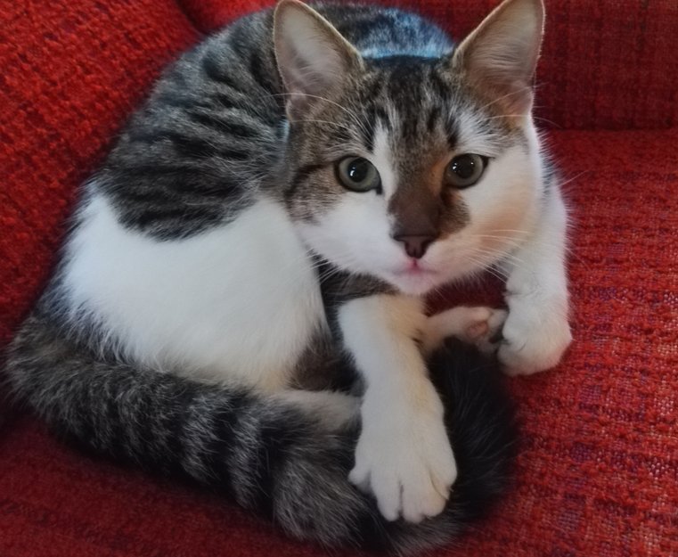 Slank hannkatt. Ikke fullvoksen. Kastrert og chippet. Ett år gammel. Han er mye hvit, med stripete mønster over rygg, hale og øvre del av ansiktet t.o.m. nesen. Halen er spesielt lang. Hvit mage og ben.Store øyne. Litt sky mot fremmede. Har aldri flyttet og heller ikke vært borte over dager. Gjemmer seg ofte under trappen o.l. og i garasje. Kan ha blitt observert nærmere Råel v. vannet. Ring uansett!!!