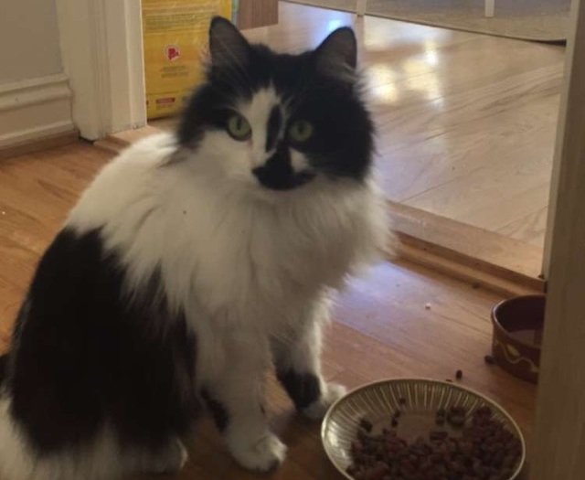 Hun har sorte flekker i ansiktet. sort og hvit langhåret katt. Stor hale. Hun har noen flekker uten hår, der håret er klippet bort på grunn av store floker.