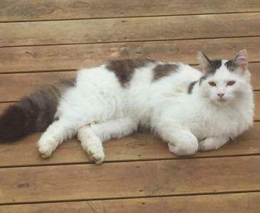 Hvit hannkatt med mørk/stripet hale og hode. Ca 3 år gammel.