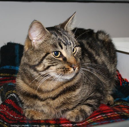 Snill og kosete gutt med togerstripet/tabby mønstret pels i sort og brun. Lysere farge under haka. Ikke kastrert eller merket.