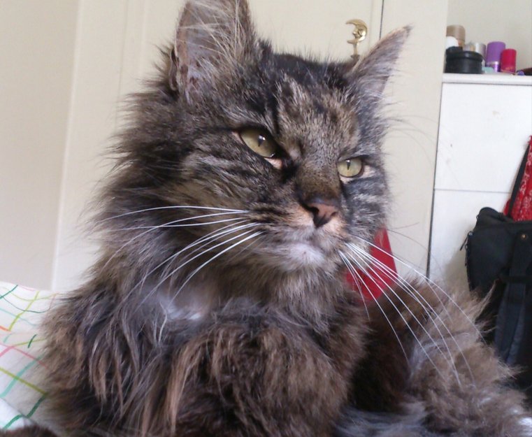 Langhåret. Eldre jentepus. Veldig tynn, muligens kronisk syk. Har øremerke, men svært vanskelig å lese og ikke funnet logisk treff. Pus har nylig fått klippet floker og tatt blodprøve.