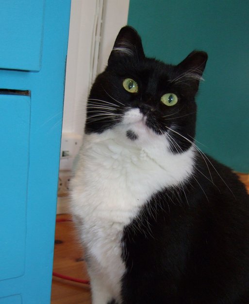 Voksen, relativt liten, tett bygd katt. Liten svart flekk i det hvite på haka. Hvit på brystet og under magen. Hvite bein med litt svart.