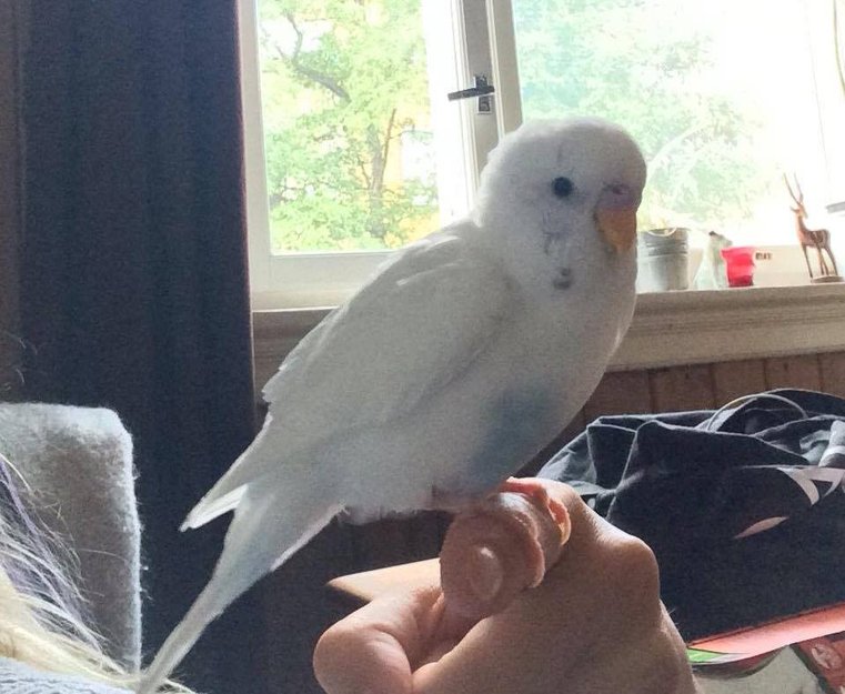 Jeg fandt en undulat nær Schultz' Gate på Majorstuen i dag. Den er hvid med lidt blåt både foran og bag.
