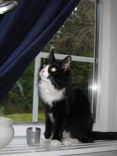 Svart og hvit. Langhåret silkepels. Stor katt da den er blandingsrase med Main Coon. Sky og forsiktig men kjælen når den føler seg trygg.