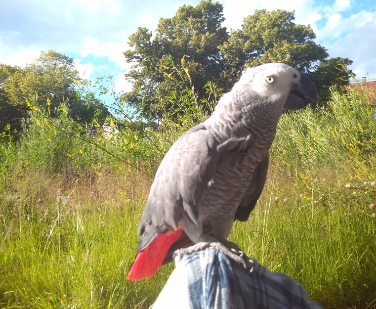 Han mangler litt fjær i nakken,er grå og har rød hale.