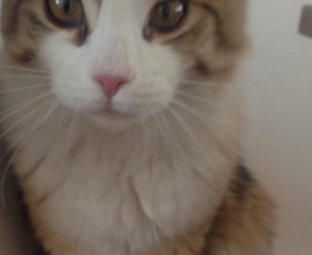 Innekatt, ikke vant til å være mye ute. Kosete og snill. Stor bustete hale og store poter.