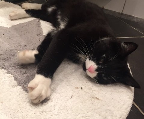Svart korthåret med hvit snute og poter. Veldig tillitsfull og kjælen. Vanskelig i si om hvilket kjønn.
