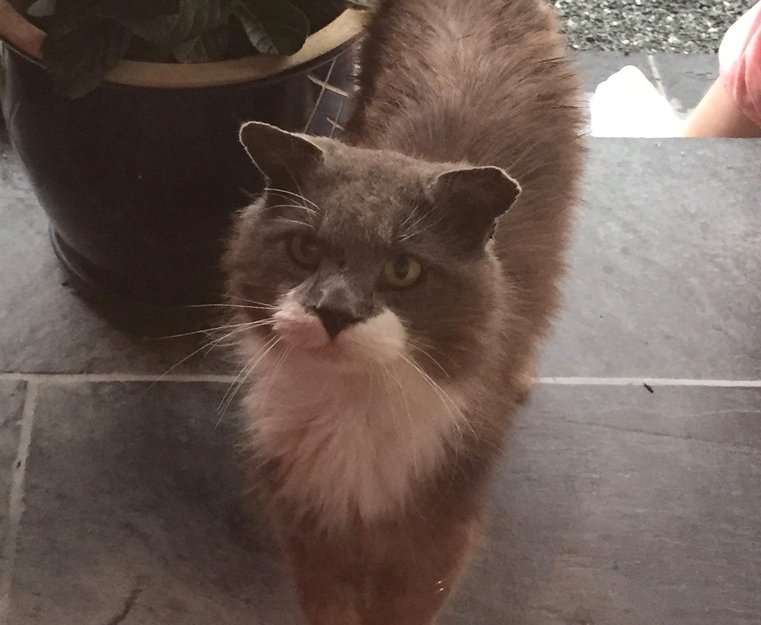 Katten har lys grå pels, med hvite "tennissokker" på bakfotene og små, hvite "ankelsokker" på fremre føtter. Har et hvit flekk på brystkassen og opp til nesen.