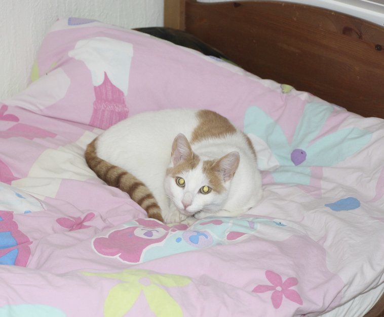 Hvit med oransje flekker på ryggen og hodet, strippete hale
