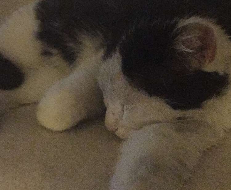 Han er en hvit og svart hannkatt, og for å kjenne han igjen har han hvit midtskill på toppen av hodet.