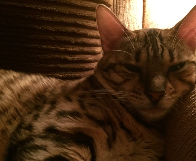 Bengalkatt med typisk leopardmønster og striper i pelsen, mørkere på ryggen. Lite hode i forhold til kropp, og mjauer ganske skarpt. Sannsynligvis halt etter fallet.