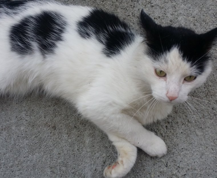 Den er svart og hvit. I godt hold og elsker godsaker. Kommer fort bort til deg. Tar du den på magen,biter den lett borti deg.